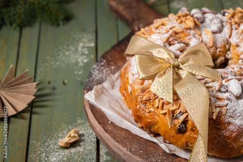 Bolo Rainha, a celebratory ring cake garnished with almonds, nuts, dried fruits, fruits raisins and dusted with powdered sugar, perfect for festive occasions like Christmas and New Year.