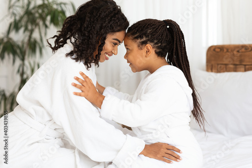 Bonding With Mom. Little Black Girl And Mother Wearing Bathrobes Hugging
