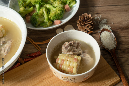 Bone soup with wood grain background