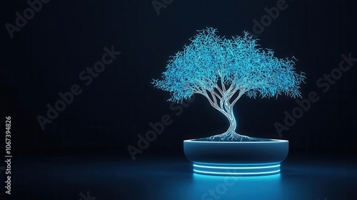 Bonsai tree with glowing circuit pathways on branches, dark background, fusion of organic form and digital design