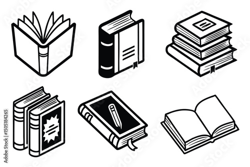 Book Icon Set – Black & White Minimalist Vector Icons of Open, Closed, and Stacked Books