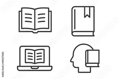 Book reading and education line icon set. Thin outline symbols for learning, knowledge, literature and library. E-book on laptop, study concept. Editable vector graphic icons.