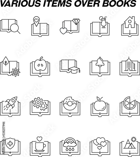Book, reading, novel, education. Editable stroke. Vector line icon set with symbols of heart, diamond, cocktail and other elements next to opened book