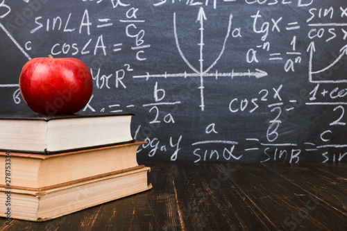 Books and an apple on a wooden table, against the background of a chalkboard with formulas. Teacher's day concept and back to school.