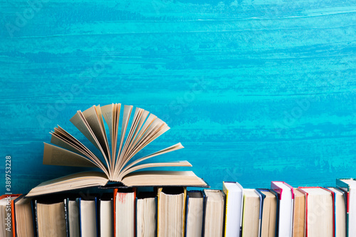 Books on wooden desk table and abstract background. Education background. Copy Space. Back to school.