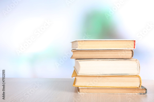 Books on wooden table on natural background