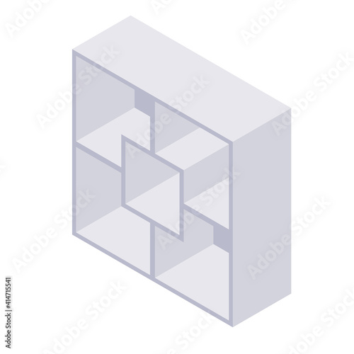 Bookshelf isometric - case and shelf for books for home and store interior design. Empty gray wooden furniture for home and shop storage in vector illustration.