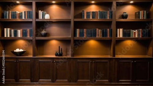 Bookshelves in cozy home settings. Elegant dark wooden bookshelves decorated with vintage books, black vases, gold ornaments, and woven baskets, illuminated by soft lighting.