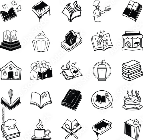 Bookstore Cafe Icons Books, Coffee, Cakes, and Culinary Delights