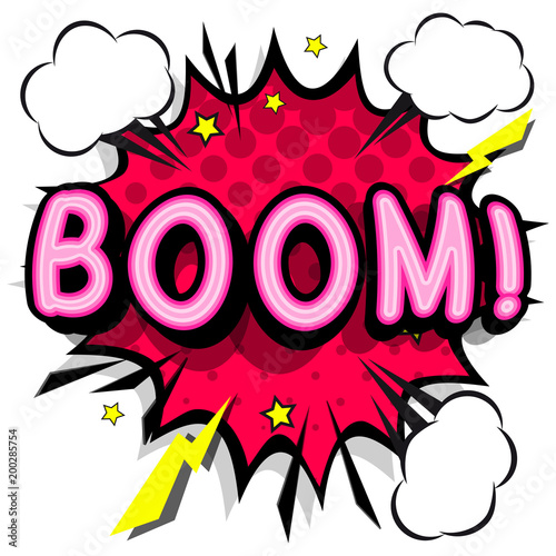 Boom - retro lettering with shadows, halftone pattern on retro poster background. Vector bright illustration in vintage pop art style.