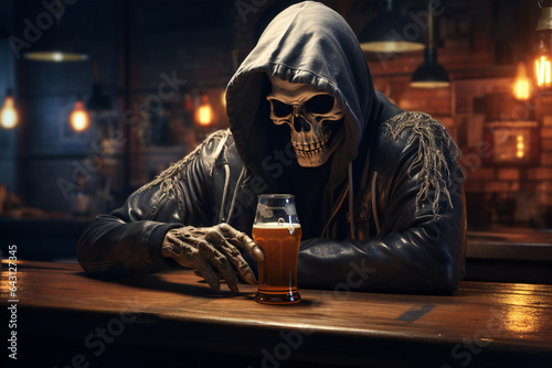 Boos and Brews: A Scary Halloween Skeleton Sipping Skull Beer in a Haunted Pub