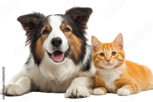 Border Collie dog and orange tabby kitten lying down together isolated on a transparent background animal