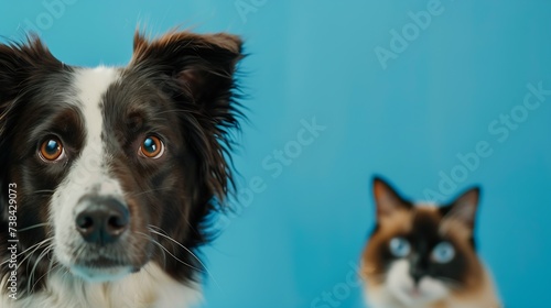border collie dog portrait with a hiding cat behind in front of a blue background : Generative AI