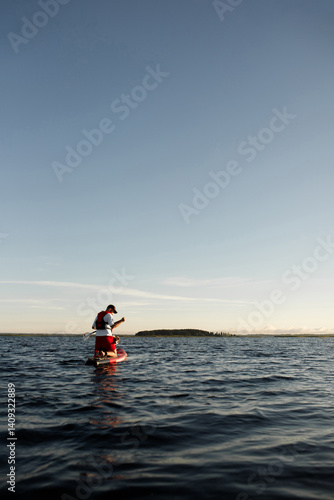Border Collie puppy in red life jacket for animals swimming on a river on a red SUP board along with his owner in a white t-shirt, red shorts and life jacket who holds a paddle on a sunny morning dawn