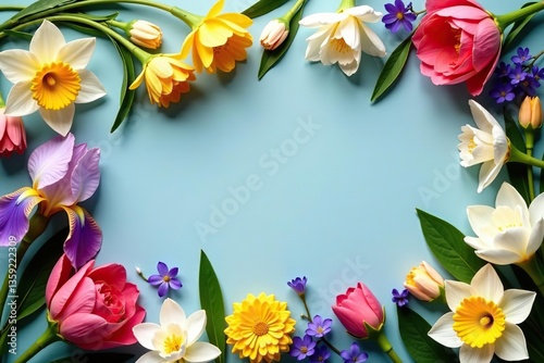 Border of blossomed garden flowers, including iris, daffodil, and protea, forming a beautiful botanical decoration Perfect for spring and summer designs, protea, summer