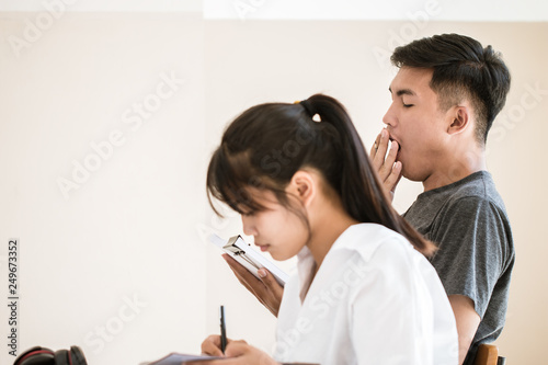 Bored Asian student man yawning near woman at classroom, feeling not motivation and lack sleep in lecture room at university