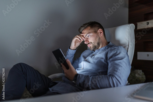 Bored young caucasian freelancer using tablet while sitting in office late at night.