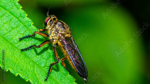 Borneo robber fly perching on the leaf. nature and environment background