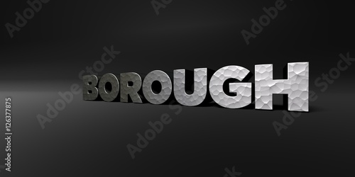 BOROUGH - hammered metal finish text on black studio - 3D rendered royalty free stock photo. This image can be used for an online website banner ad or a print postcard.