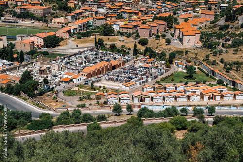Bosa, Sardinia, Italy - June 15, 2017: Cemetery of seen from the old castle of Malaspina.