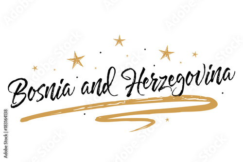 Bosnia and Herzegovina. Name country word text card banner script. Beautiful typography inscription greeting calligraphy poster black gold ribbon star. Handwritten design modern brush lettering vector