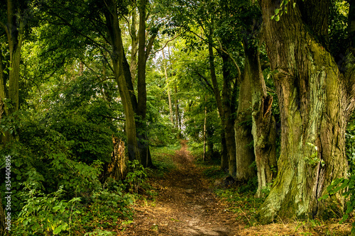 Bosque mágico con árboles verdes y frondosos y camino al centro