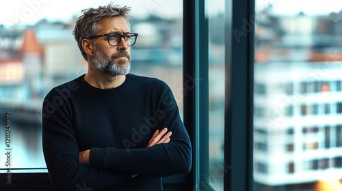 Boss standing by a window with takeaway coffee during a thoughtful moment in a modern office