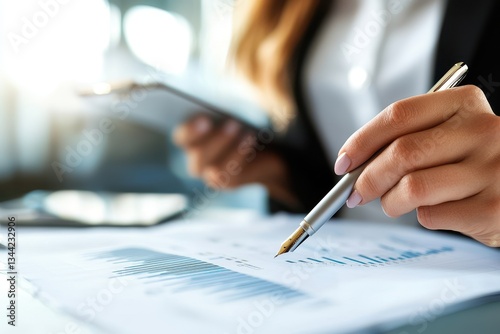 boss woman with ambition and achievement concept. Professional analyzing financial data with a pen and clipboard in a modern office setting.
