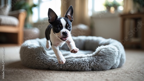 Boston Terrier puppy jumping and playing into a soft fluffy bed. She is inside a room with carpet.