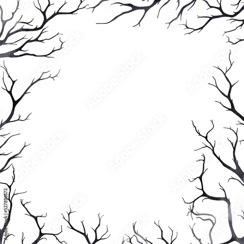 Botanical border PNG with transparent background, old dry tree branches, dark frame on white, perfect for Halloween