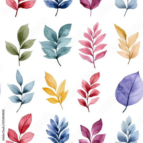 Botanical Burst: A vibrant pattern showcases an array of stylized leaves, each painted in a spectrum of colors. This botanical design exudes a sense of freshness and natural beauty.