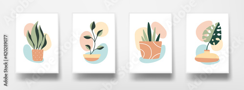 Botanical floral wall art set. Abstract plants graphics on white sheet of paper. Home decor wall posters. Flat design modern background. Vector illustration.