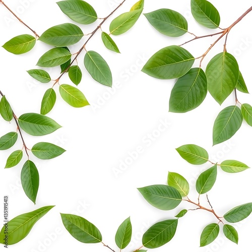 Botanical Frame with Fresh Green Leaves on Branch, Isolated on White