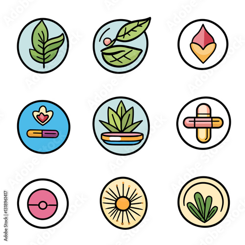 Botanical Icons with Medical Concepts in Line Art Style Composition
