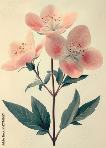 Botanical Illustration of Rosa Carolina Flowering Plant with Vintage Style