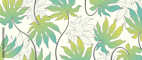 Botanical leaf line art wallpaper background vector. Luxurious hand drawn foliage design in a minimalist linear outline simple boho style. Design for fabric, print, cover, banner, invitation
