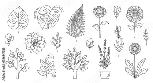 Botanical Line Art Collection - Diverse Plant Illustrations for Design.
