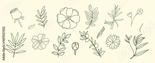 Botanical line art set with flowers and leaves, minimalist floral illustrations