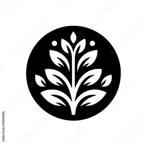 Botanical Logo: Modern Minimalist Leafy Branch in Black Circle