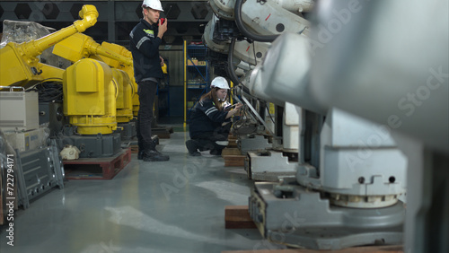 Both of engineers working together in a robotic arm factory, Robotic arm industry and engineering concept.
