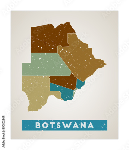 Botswana map. Country poster with regions. Old grunge texture. Shape of Botswana with country name. Charming vector illustration.