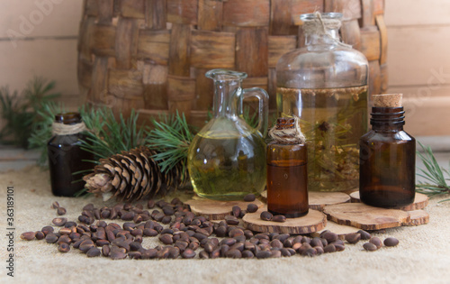 Bottle of aroma oil cedar and homemade tincture cedar.