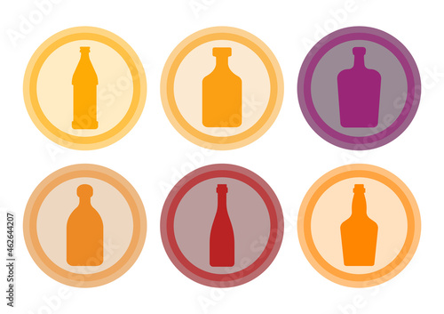 Bottle of beer, rum, liquor, tequila, red wine, whiskey. Background is circle. Isolated color object design beverage. Graphic illustration in flat style. Simple icon for restaurant, pub, party