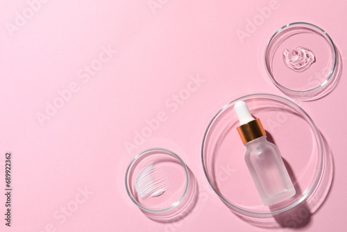 Bottle of cosmetic serum and petri dishes with samples on pink background, flat lay. Space for text