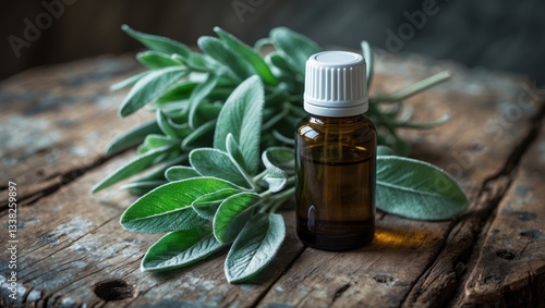 Bottle of essential oil placed on a weathered wooden surface. Medicinal herb
