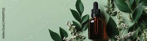 bottle of essential oil surrounded by herbs and flowers on green background.illustration