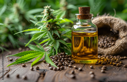 Bottle of hemp oil with cannabis leaf and scoop of beans. Cannabis oil