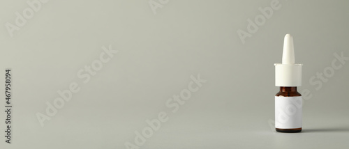 Bottle of nasal spray on light grey background, space for text