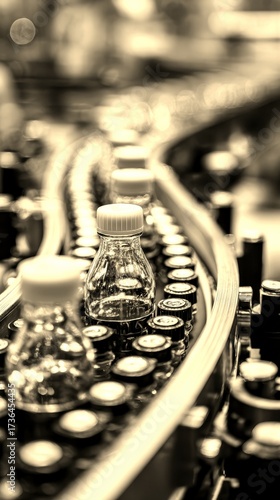 Bottled beverages on a production line with caps moving through a factory in a modern facility
