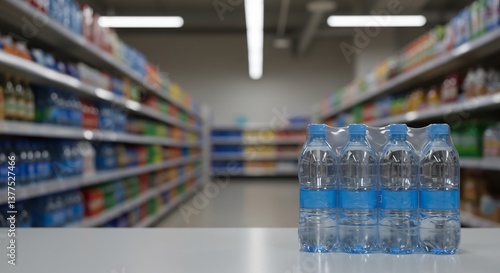 Bottled water on supermarket shelf soft light. AI Generated